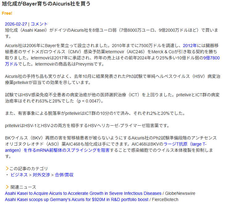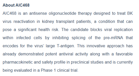 旭化成が買うAicuris社の抗BKウイルス(BKV)薬AIC468の作用 None Twitter Facebook はてブ Pocket LINE コピー 2026.02.27 AIC468はBKウイルス(BKV)のラージT抗原(large T-antigen)を作るmRNA前駆体のスプライシングを阻害することで感染細胞でのウイルス本体複製を抑制する。