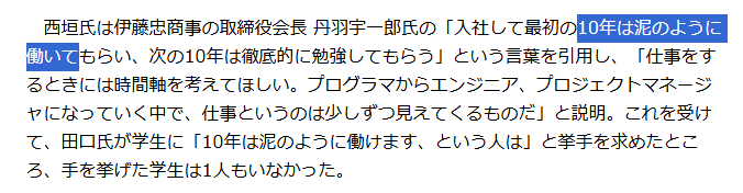 10年は泥のように働く None Twitter Facebook はてブ Pocket LINE コピー 2026.02.27 今やよわい53歳。結果的に10年は損得勘定なしで泥のように働いた。そのおかげで経済的な余裕ができて今は楽になっている。好きではない仕事で泥のように働くことはおそらく困難で、とにかく好きなことをしていれば必然的に10年は泥のように働けると、今になって思う。