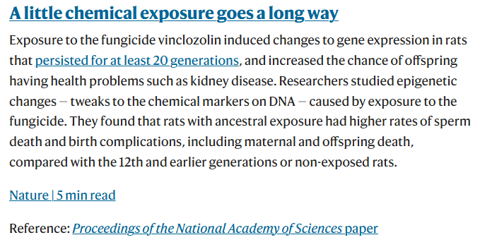 ラットでの検討。ビンクロゾリン(vinclozolin)がもたらす遺伝子発現変化は少なくとも20世代先まで続き、腎疾患などの不調を生じやすくする。ビンクロゾリンに浴した祖先を持つラットは精子が死にやすく、母体や子の死などの妊娠合併症を被りやすい。