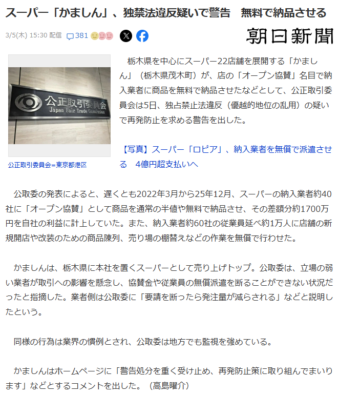 スーパー「かましん」、独禁法違反疑いで警告 無料で納品させる None Twitter Facebook はてブ Pocket LINE コピー 2026.03.06 実家の近くにあって帰省の際にはたいてい買い物で足を運ぶ。牛肉の塊のコーナーを見るのが楽しい。